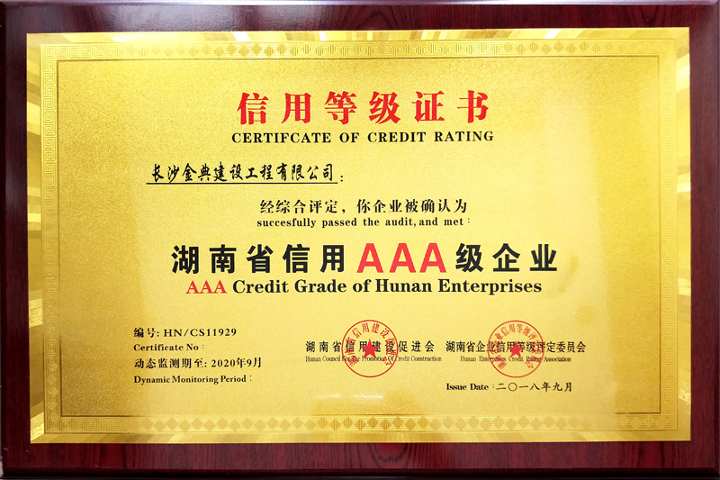 公司十分注重品牌和形象。堅守質量塑品牌、信譽樹形象,管理出效益的原則。堅持“質量是企業的生命”的理念,引領著數十支作風強硬、技術過硬、經驗豐富、敢打硬仗的各種專業施工隊伍, 在激烈的市場競爭中,奠定了“專業體現價值,細節成就品質”的企業形象。先后榮獲湖南省“湖南誠信企業”、“質量優勝企業”、“安全生產先進企業”、 “縣施工質量安全標準化示范工地”等稱號;2013至2017年連續五年被長沙市建筑業協會評為“建筑業施工總承包先進企業”,?2014年至2016年連續三年被評為“長沙市建筑業AAA信用企業”。??