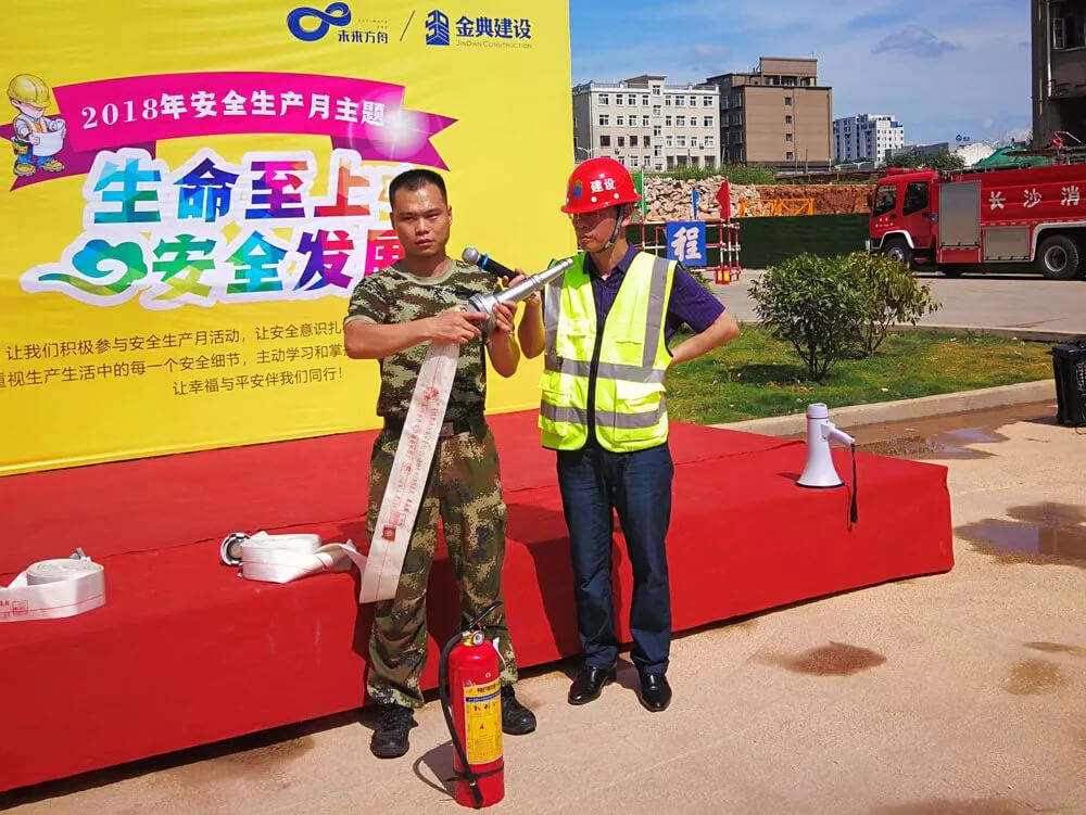 2018年6月27日下午,長沙金典建設工程有限公司與潤怡集團攜手在未來方舟三期項目舉行消防知識培訓應急預案演練。整個演練共分為現場模擬火災疏散急救、模擬觸電事故急救二個過程,歷時3小時,涉及人員200余人,寧鄉經開區規劃建設局質安站的相關領導也蒞臨現場觀摩指導。